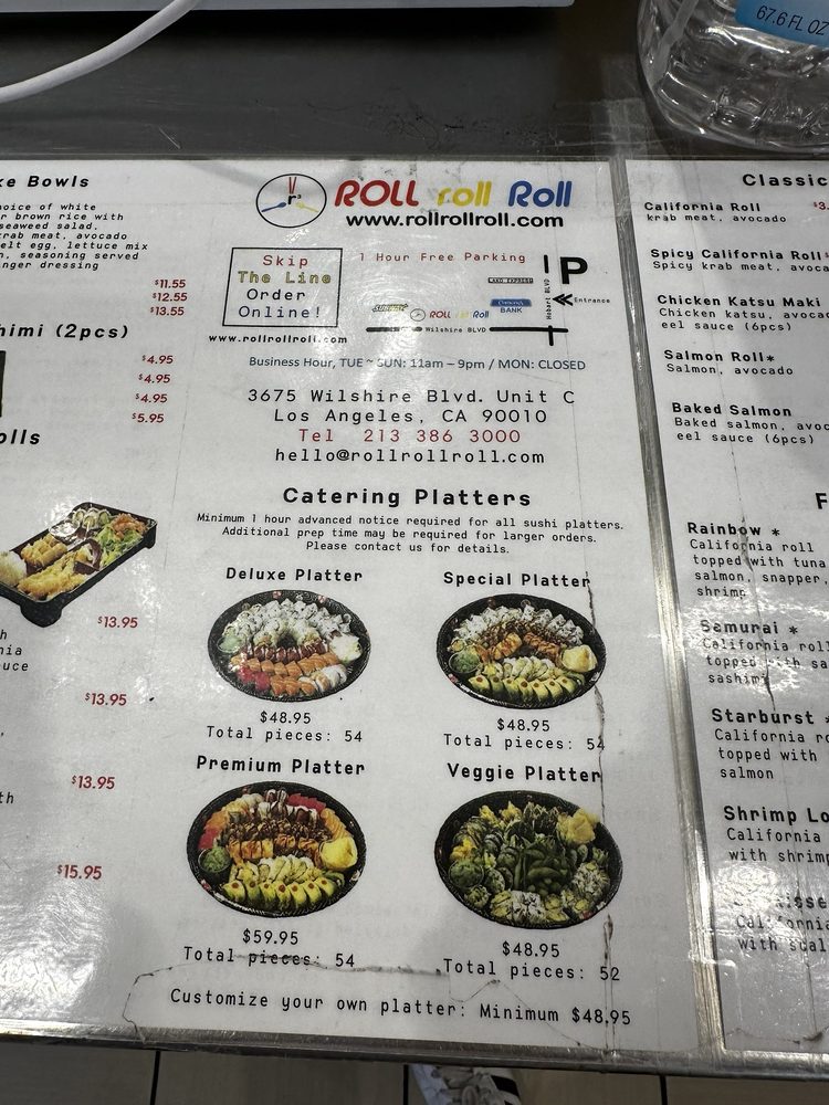 “ To those of you looking for a no-frills yet VERY affordable restaurant to get your sushi fix, I would highly give "Roll Roll Roll" a try. And finding a decent sushi place in LA that won't quite burn a hole in your wallet is a more daunting task than you might think. Since I was in the area, I decided to pay a visit here during the afternoon of Sunday 7/28/2024 at around 12:15pm. As far as the location, this place is situated in the Koreatown neighborhood of Los Angeles directly on Wilshire Blvd and just a few blocks east of Western Ave. Parking can be a challenge on Wilshire Blvd but there is a dedicated parking lot that offers up to 1 hour of free parking. However, their hours of operation are very generous as they are open 7 days a week from 11:00am to 9:00pm. As I mentioned earlier, the inside of this place is no-frills yet it offers a very sizable dining area for small and large parties. You will notice bright orange-colored walls complete with menus of all their options. They even offer pre-packaged sushi boxes (much like what you'd find at the grocery store) as well as edamame, rice, and other various Japanese appetizers. Best of all, to those watching their sodium level, there is no MSG in any of their food items. Their menu packs in quite a selection including the popular sushi rolls (classic, baked, tempura, and many other varieties). In addition, they offer sashimi, nigiri, bento boxes, salads, Poke bowls, small plates, and appetizers. What really drew me here was the affordability on all of their items as prices here are arguably less than the majority of places in the area. During my visit, I went with the "Chicken Katsu Maki" roll (priced at $3.75 for 6 pieces) and a "Vegas" roll (priced at $8.88). And to those who have not been here yet, for every meal purchase (which I am guessing has a minimum amount to spend), you get a free complimentary miso soup. Ordering time it took for me was roughly 12 minutes. As far as the overall taste, presentation, and consistency of my two rolls, both of them were above average. The fish in my Vegas roll (which had baked salmon, imitation crab meat, deep fried avocados, and eel sauce) was very fresh and didn't have that fishy taste to it. As far as the Chicken Katsu Maki roll, there were very generous amount of chicken as this was a real bargain at under $4. And the miso soup being included in this packaged deal made this lunch experience much less than what you'd spend at a typical fast food place but far superior quality. All in all, "Roll Roll Roll" absolutely exceeded my expectations. Not a five-star experience by any means since it is not top shelf cuts of seafood. But if you're in a hurry, on-the-go, or looking for a low cost option for lunch, dinner, or just a quick snack, I would definitely give them a try. They do offer online ordering and well as phone orders. So with above average customer service, amazingly affordable prices, and decent sushi in the heart of Los Angeles, give Roll Roll Roll a try. My rating, four stars. ”